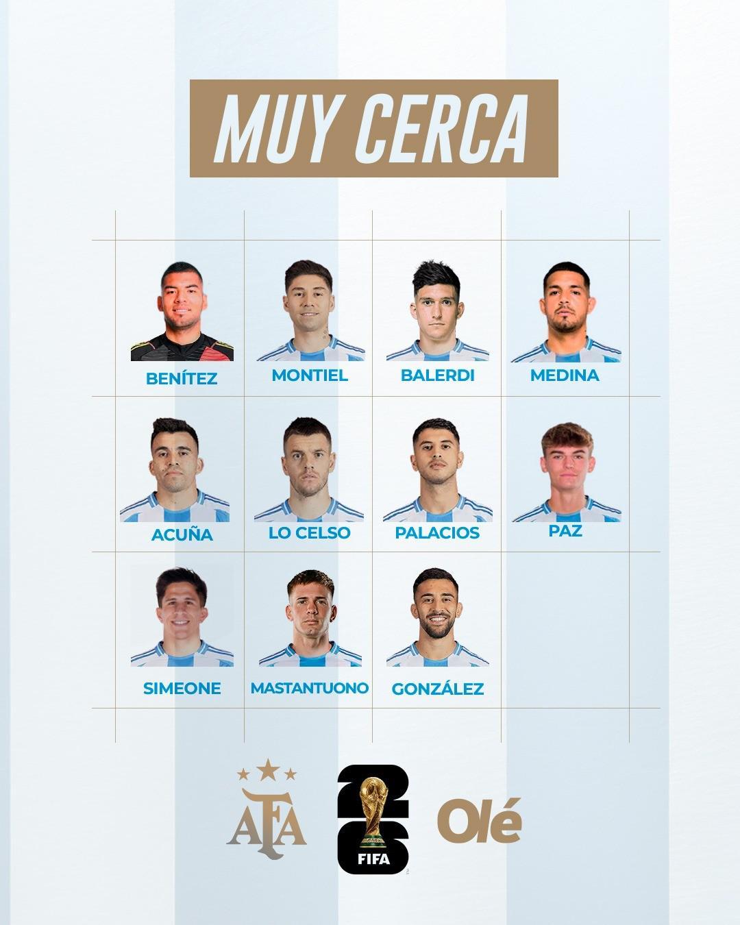 此外还有10名球员十分接近但仍需要进一步为自己参加世界杯的机会而战,他们分别是门将瓦尔特-贝尼特斯,后卫蒙铁尔、巴列尔迪、法昆多-梅迪纳、阿库尼亚,中场洛塞尔索、埃塞基耶尔-帕拉西奥斯、尼科-帕斯,前锋朱利亚诺-西蒙尼、马斯坦托诺以及尼古拉斯-冈萨雷斯。