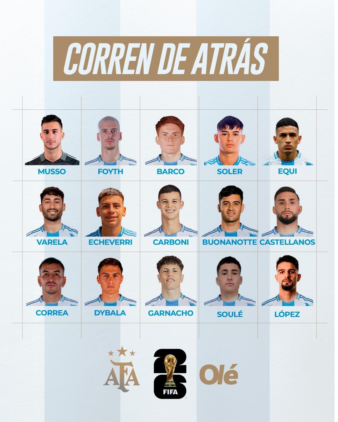 除了上述的25人以外,《奥莱报》还列出了15名值得关注的候选球员,其中包括了门将穆索,后卫福伊特、巴伦廷-巴尔科、胡利奥-索莱尔,中场埃塞基耶尔-费尔南德斯、阿兰-巴雷拉、埃切韦里、巴伦廷-卡尔博尼、法昆多-博纳诺特,前锋卡斯特利亚诺斯、安赫尔-科雷亚、迪巴拉、加纳乔、马蒂亚斯-苏莱以及何塞-洛佩斯。