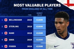 体育资讯3月25日讯 英格兰将在本轮世预赛主场迎战拉脱维亚,《转会市场》也统计了英格兰球员历史身价前十均达到1亿欧元大关。