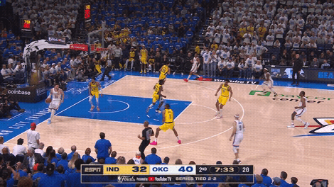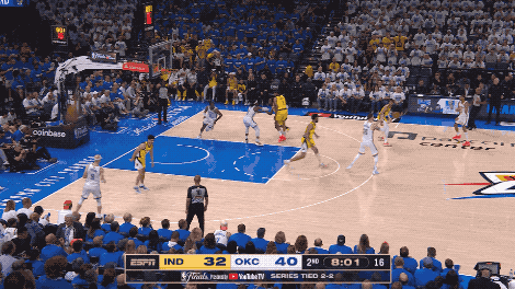 第二节末布拉德利再次登场的时候,雷霆已经很明确要从这里撕开步行者队防守了。